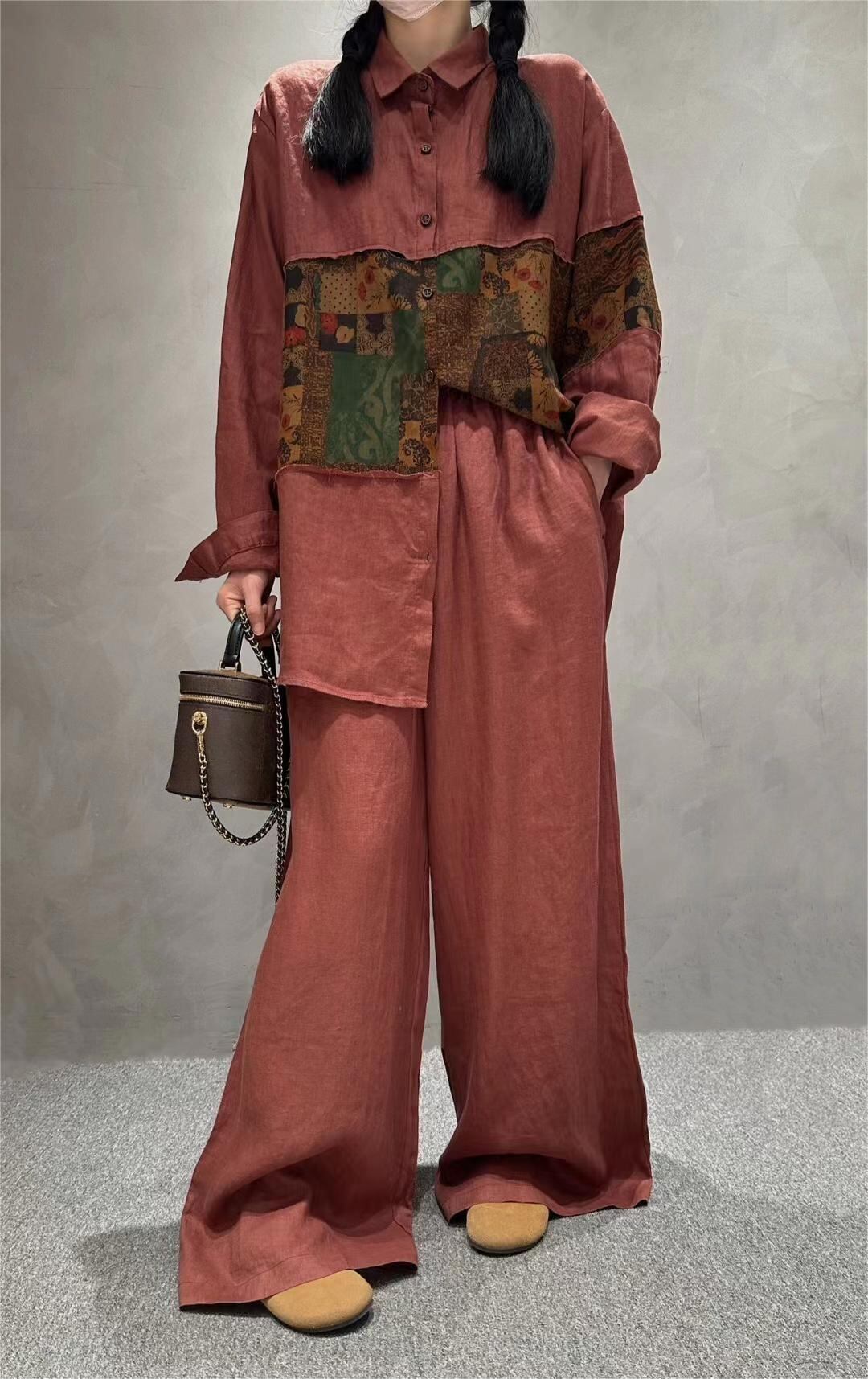 レディース 綿麻混 ワイドパンツ ボトム ゆるパン シェフパンツ 上下セット