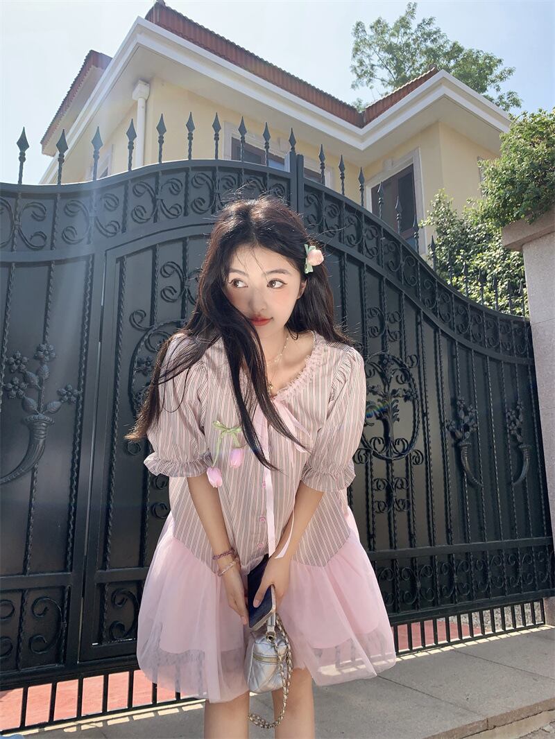 2025春夏新作 女 レディース ハイウエスト 半袖 ボーダー柄 ミニ ワンピース ドレス 台型スカート