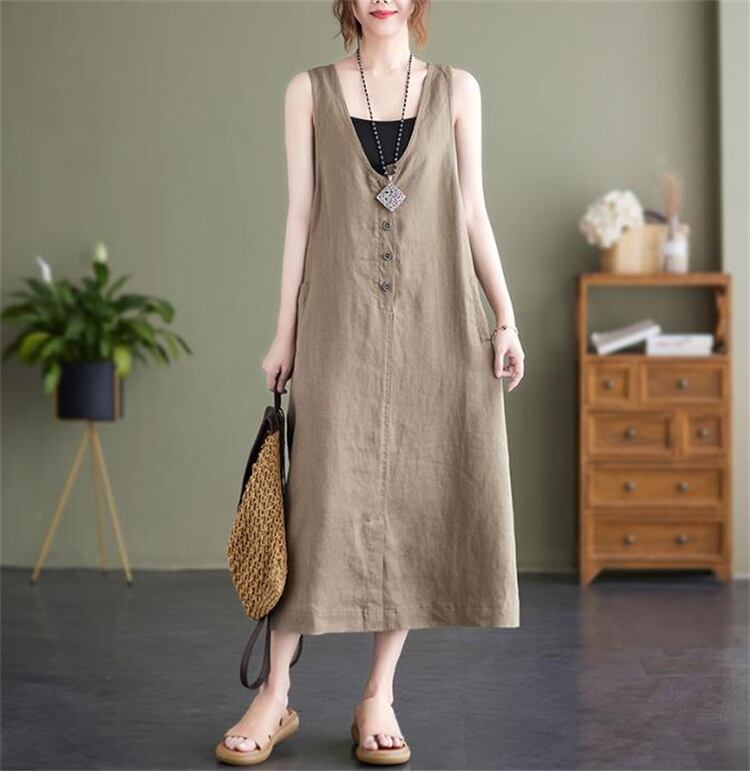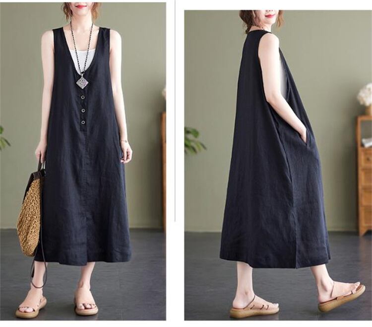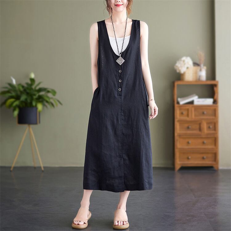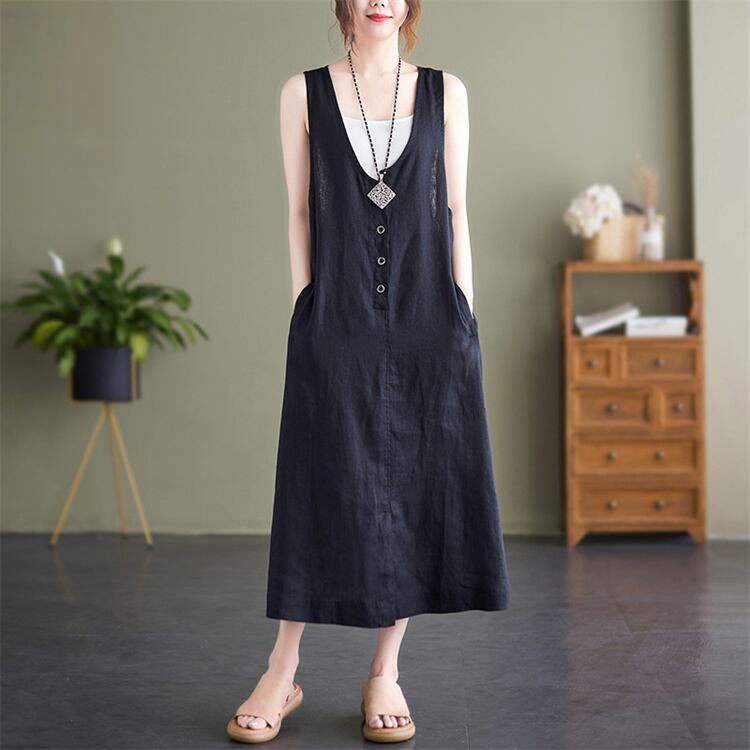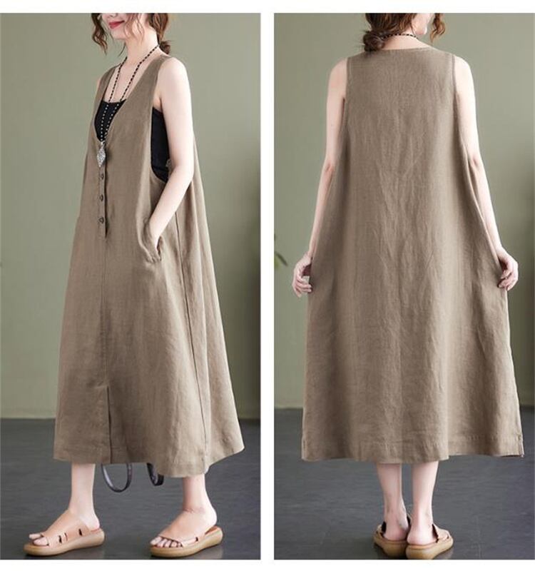 【ヴィンテージ風】2025夏 麻混 ノースリーブワンピ オーバーサイズ ロングスカート