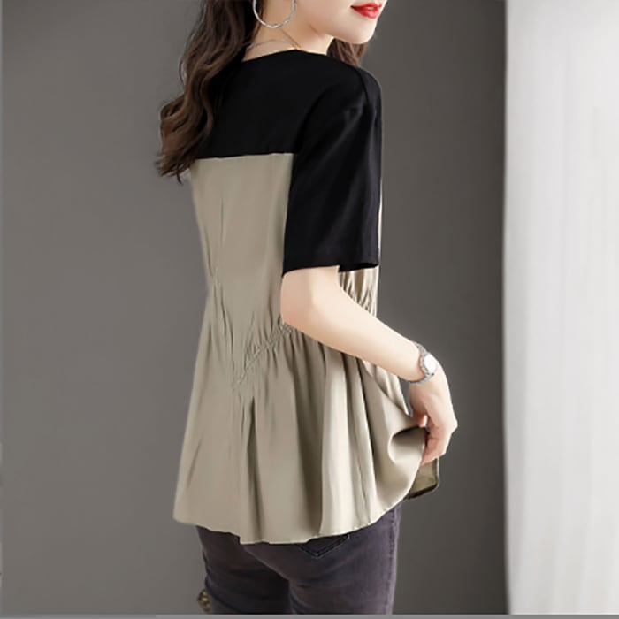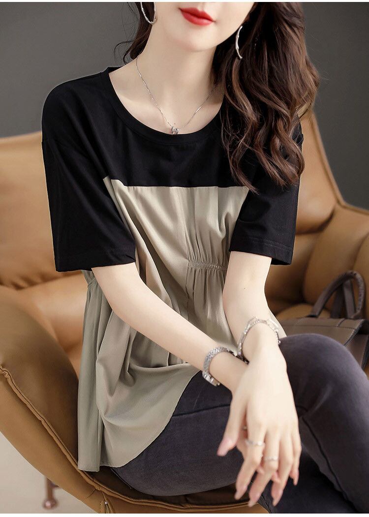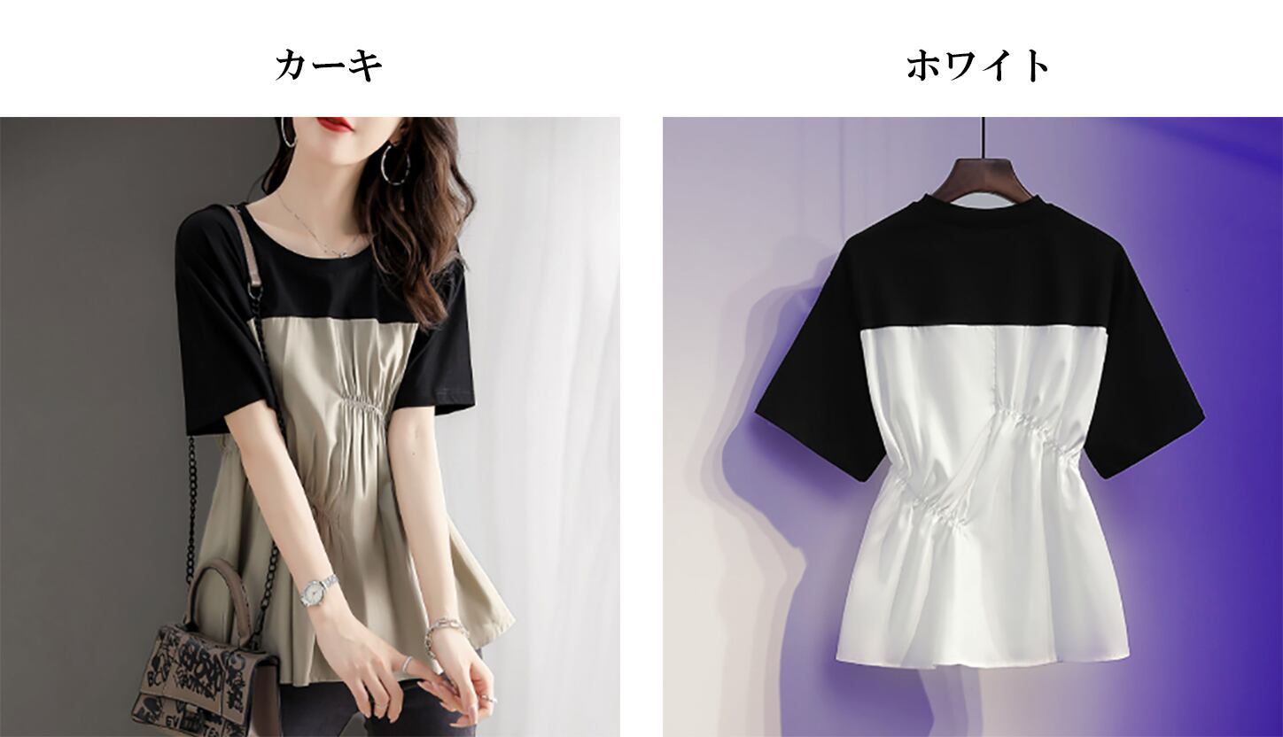 2025新作 クルーネック tシャツ ブラウス ギャザー 配色 異素材 切り替え カジュアル 半袖 体型カバー