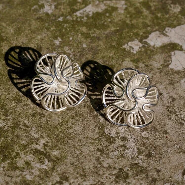 人気沸騰 大人気 立体フラワーモチーフのアートイヤリング 透け感&シボ調で上品な輝き