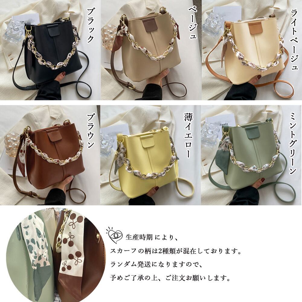 バックの持ち手全体に添わせて巻いているスカーフリボンがおしゃれ感ぐっと増すバケツバッグです