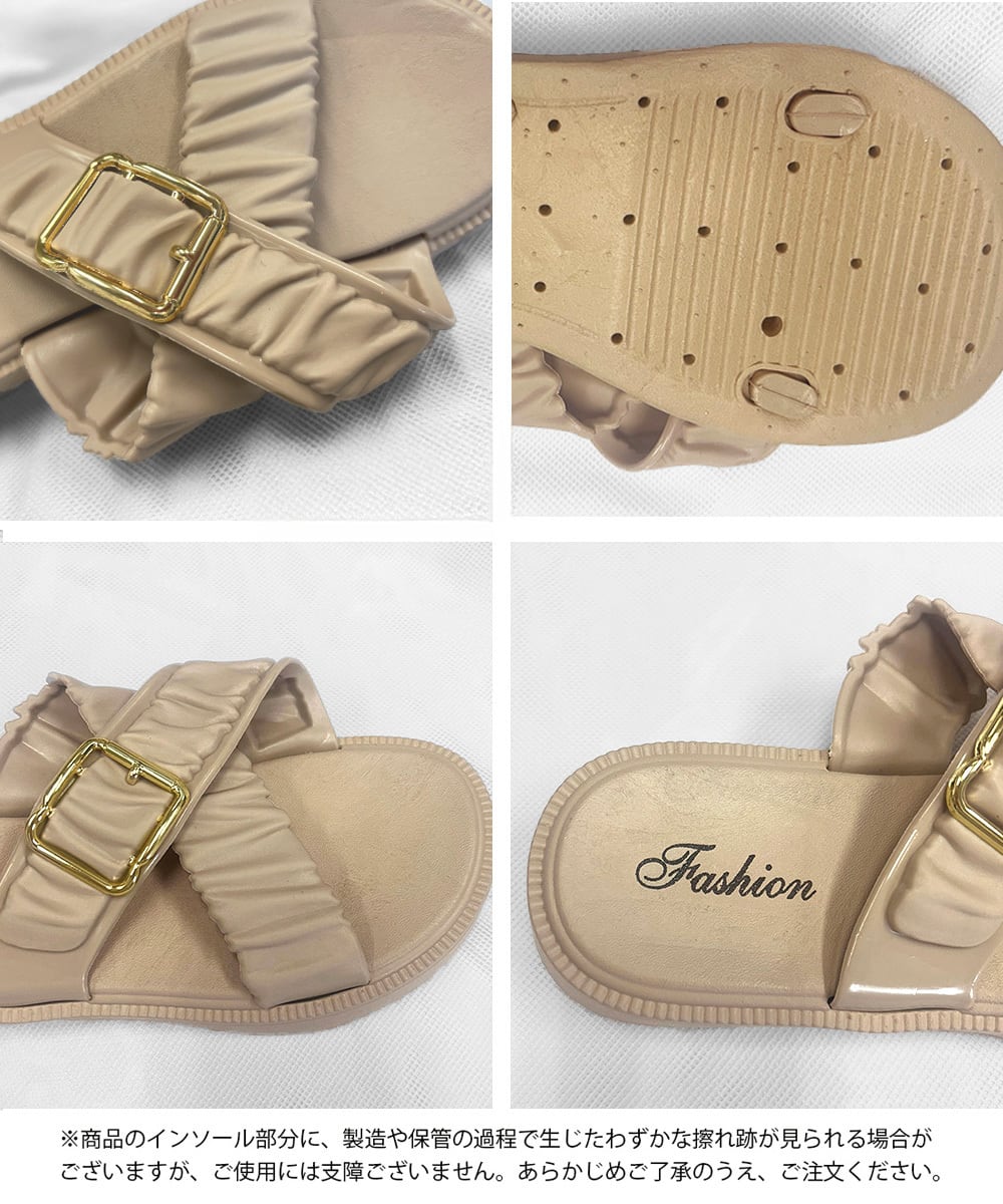 ギャザーベルトにゴールドバックルをあしらった、可愛くておしゃれ度満点のサンダル
