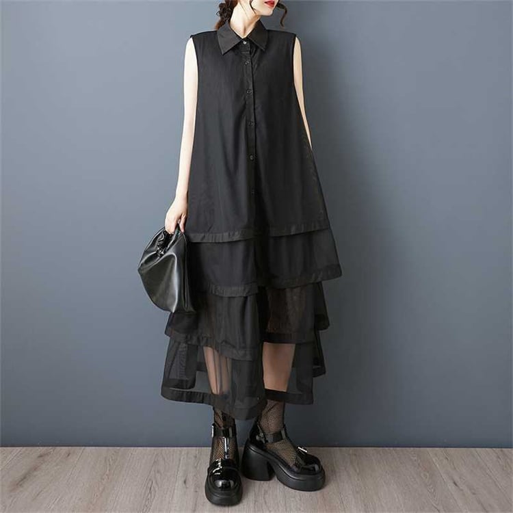 夏物 大きいサイズ 無袖ワンピース ゆったり仕立て ネットレース継ぎ レイヤードスカート