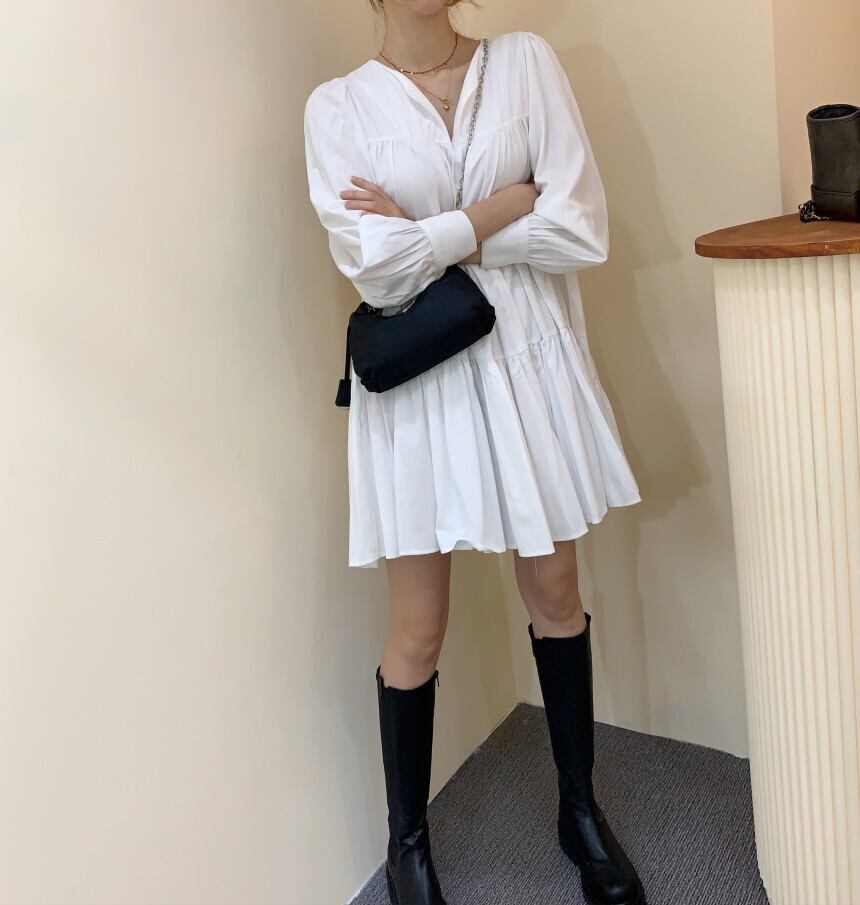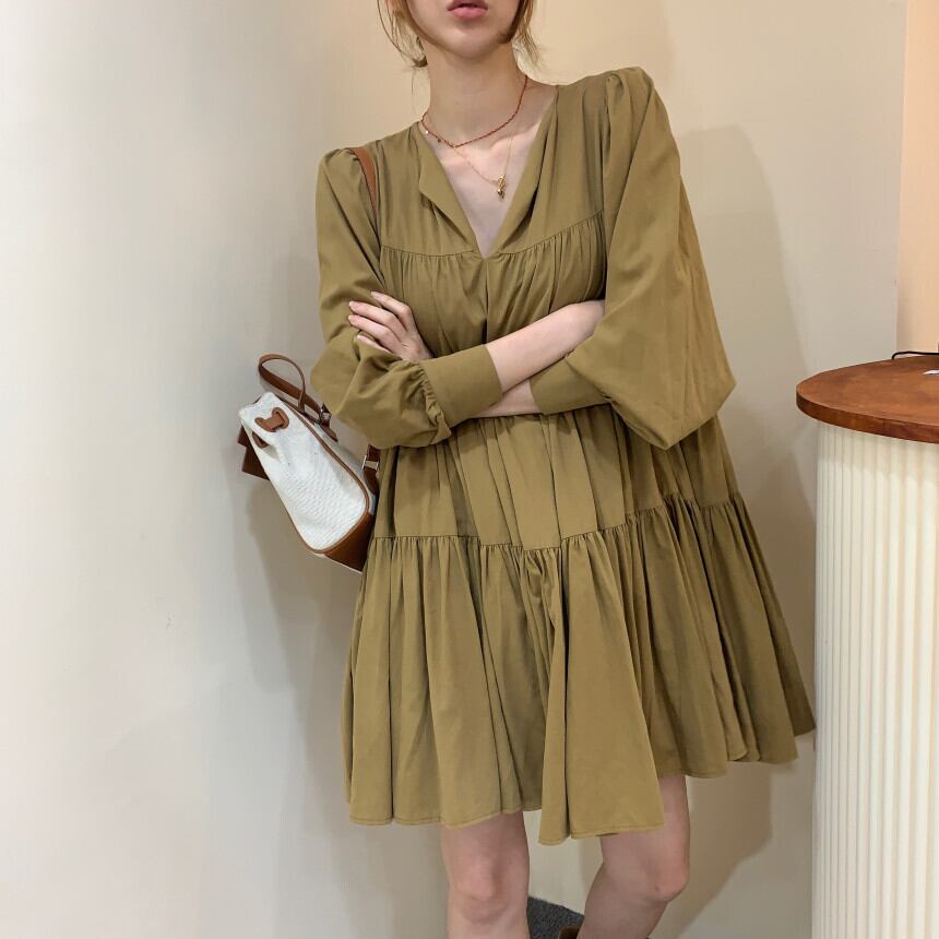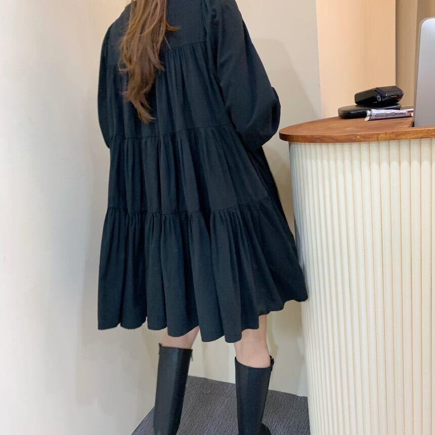 2025春秋新作 女 レディース ハイウエスト 長袖 無地 ミニ ワンピース ドレス 台型スカート