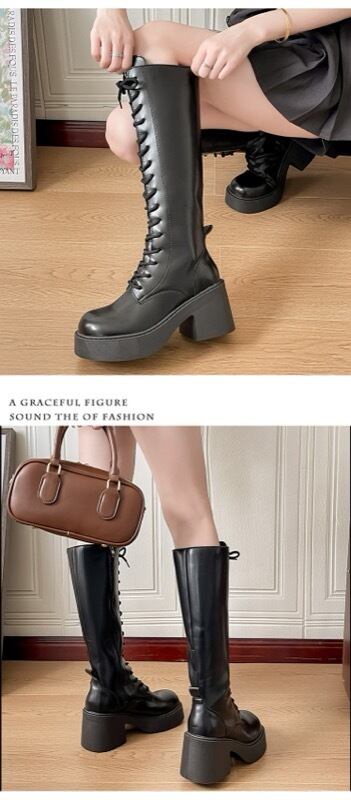 膝下丈ロングブーツ 厚底インヒール 英国風編み上げデザイン 太ヒールで細見えするライディングブーツ