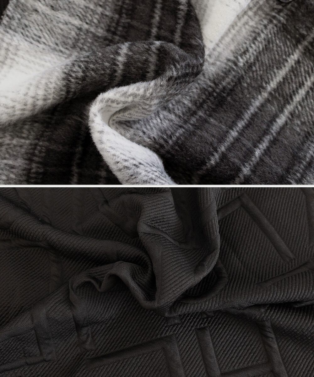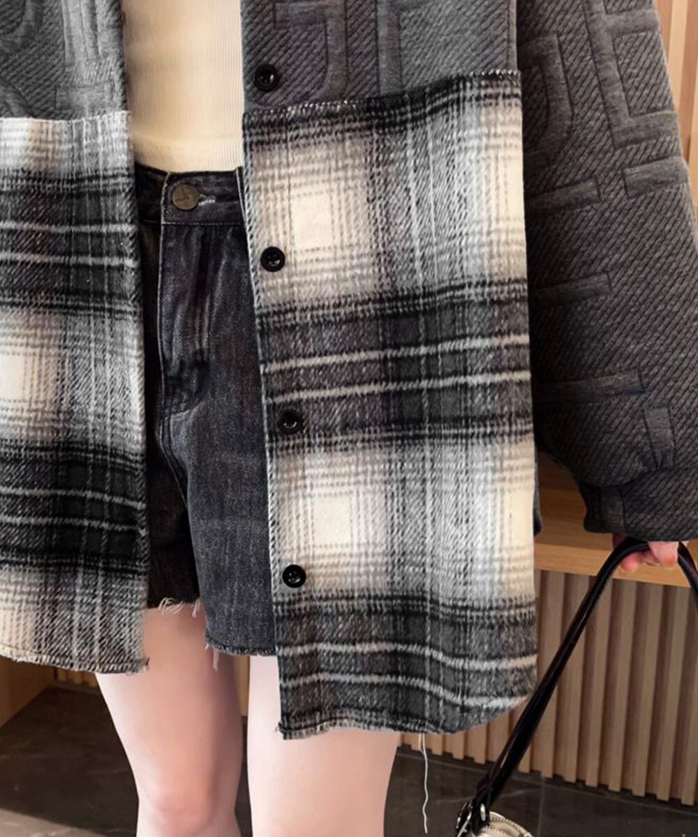 チェック柄の切り替えがアクセントになった、型押し加工のスウェット風オーバーサイズシャツジャケット。