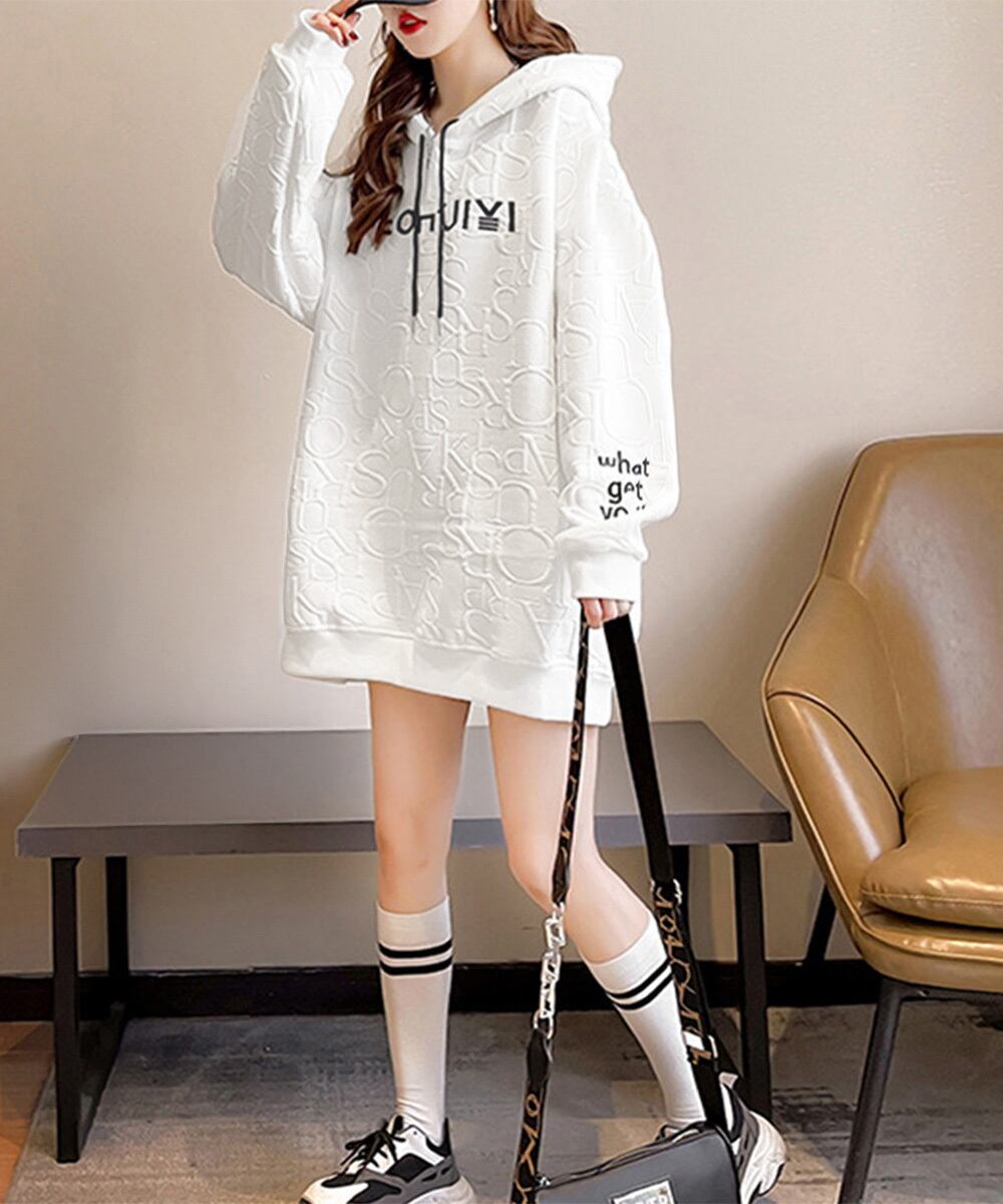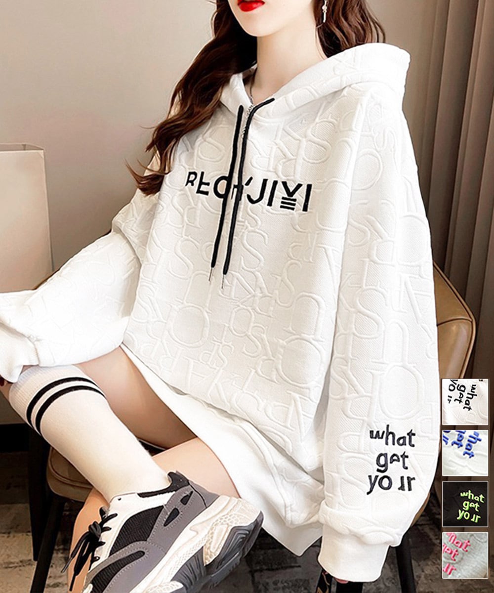立体感ある同色のエンボス加工ロゴがアクセントになったオーバーサイズパーカー