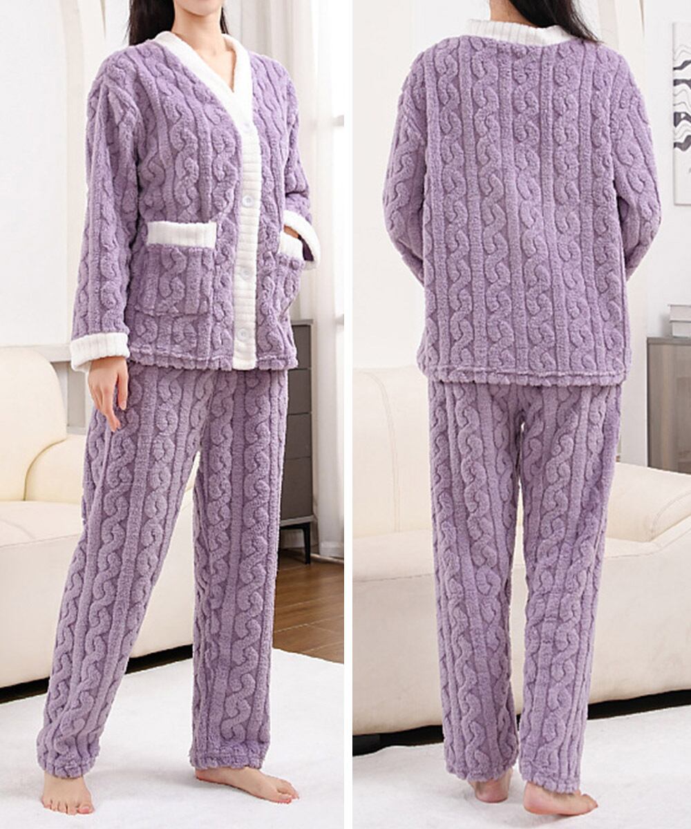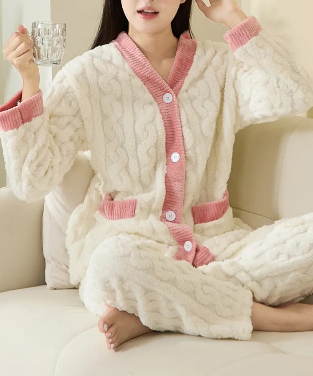 ケーブル柄のふわふわフリース素材で仕上げたパジャマ上下セット。