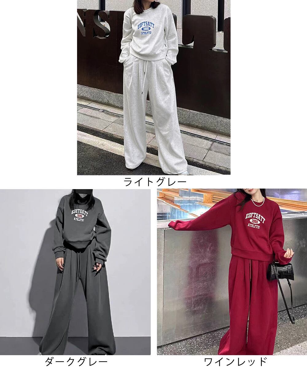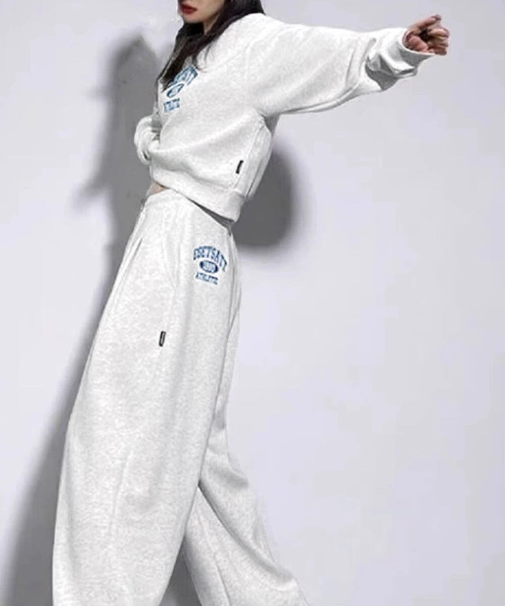 カレッジロゴが目を惹くスウェットトップスとワイドパンツのレディースセットアップ。