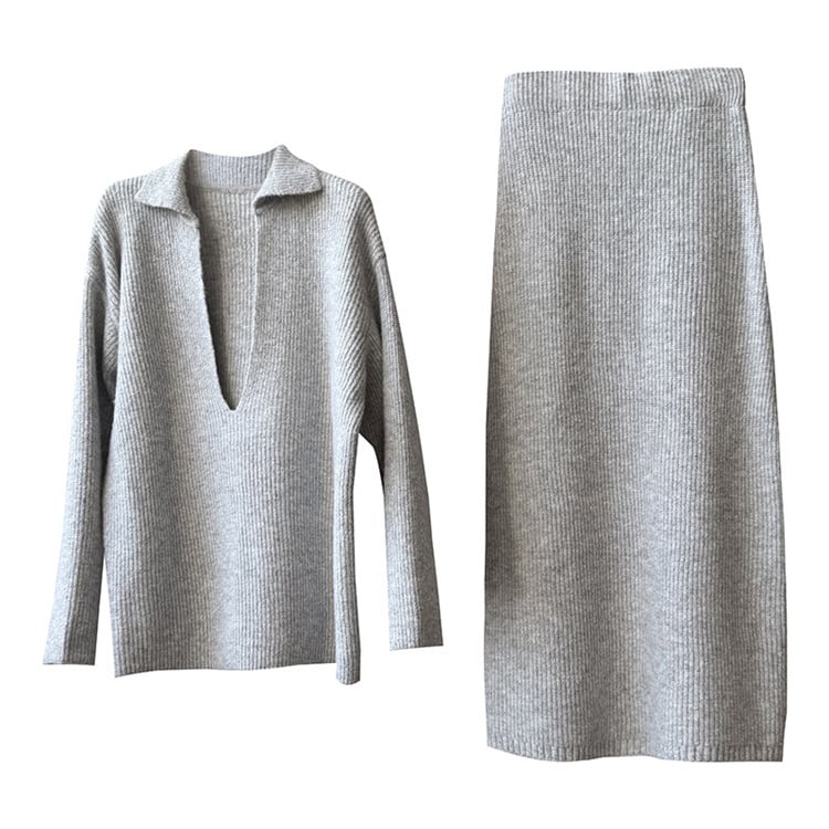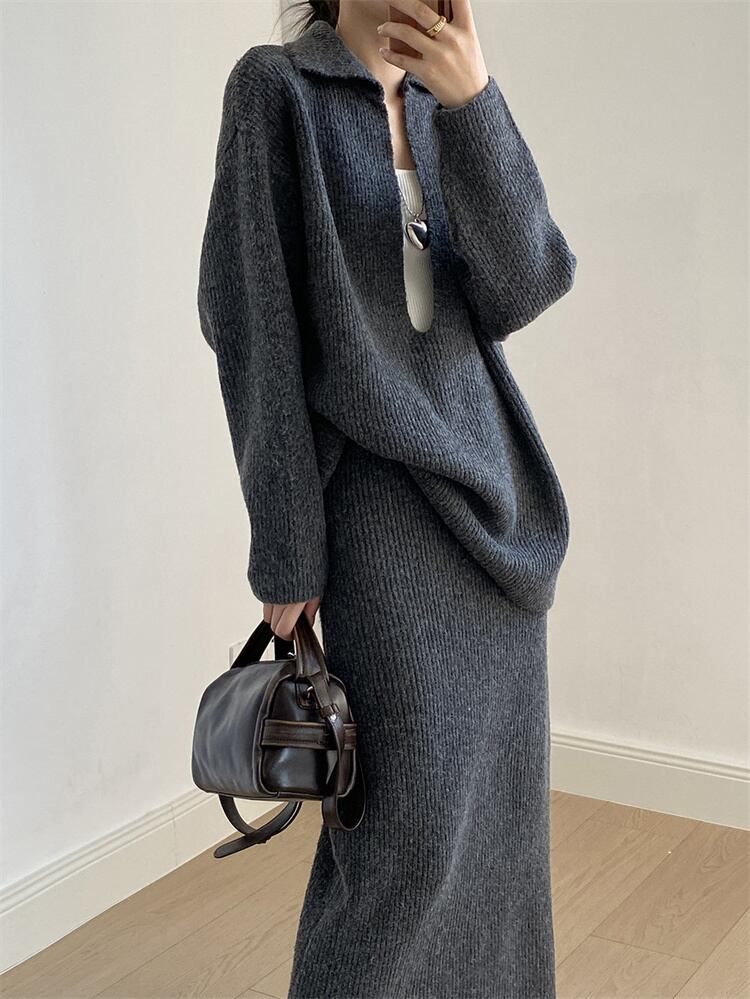 深Vネック ゆったりセーター ハイウエストニットロングスカートセット 2025秋 カジュアルコーデ