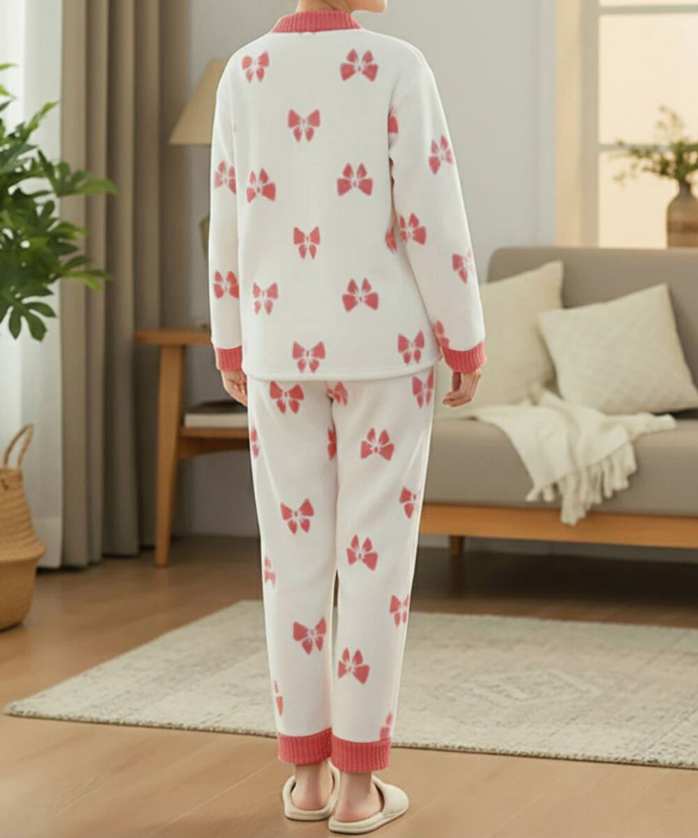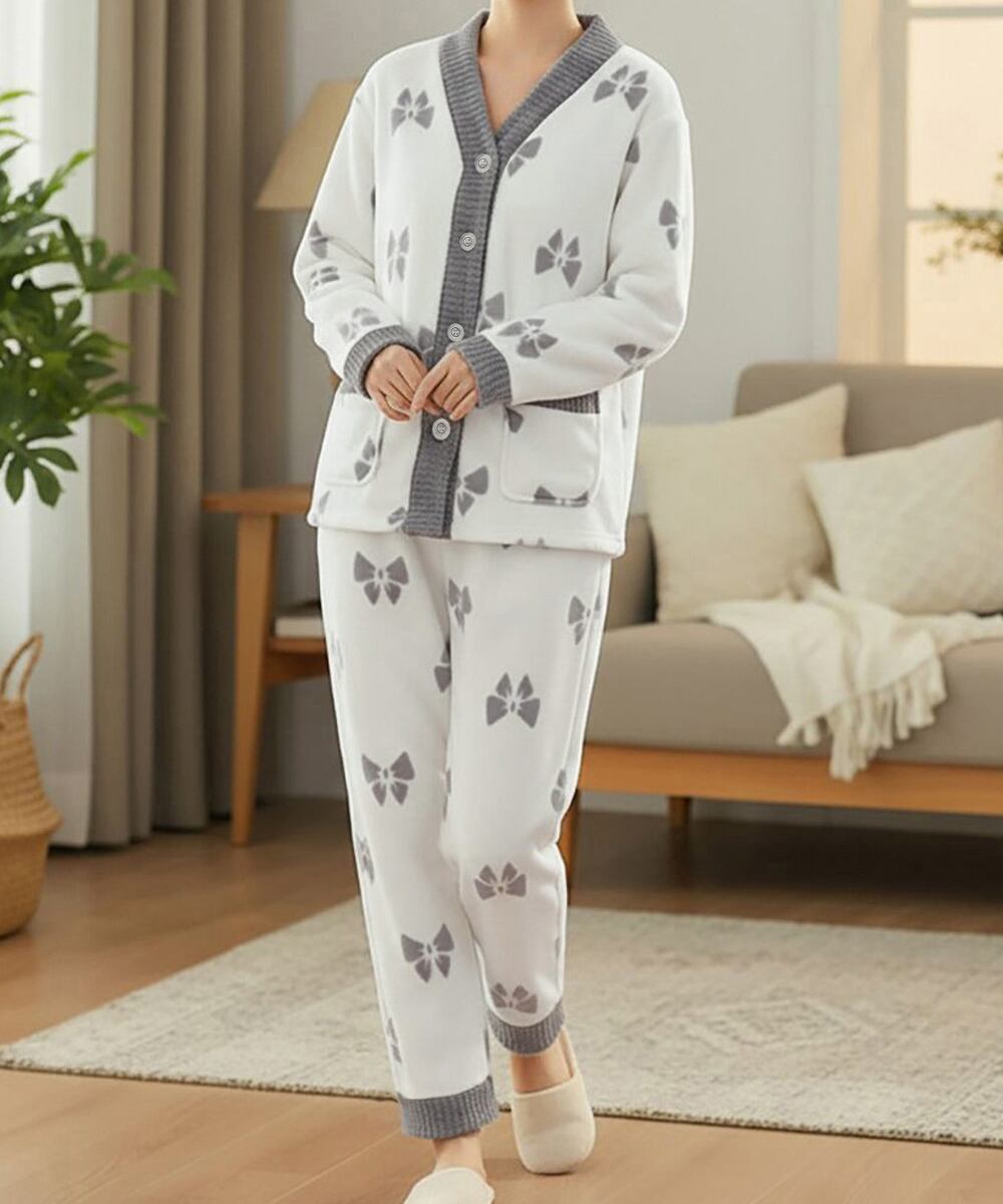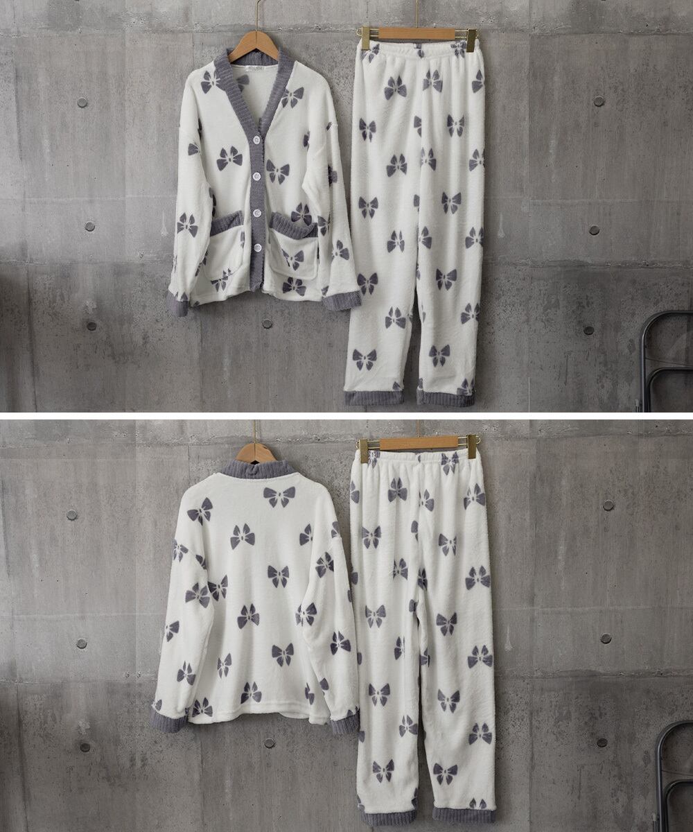 リボン柄が可愛いフリースカーディガンとパンツのセットアップルームウェア。