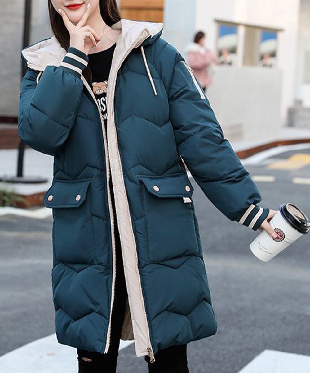 冬のスタイリングに取り入れたい、ミディアム丈のフード付き中綿フェイクダウンコート。